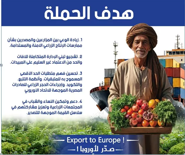 وتهدف حملة «صدّر لأوروبا» إلى رفع مستوى الوعي لدى المزارعين والمُصدّرين وأطراف سلاسل القيمة الزراعية بمتطلبات النفاذ إلى الأسواق الأوروبية، من خلال تعزيز تطبيق الممارسات الزراعية الجيدة (GAP)، والإدارة المتكاملة لمكافحة الآفات (IPM)، والالتزام بحدود متبقيات المبيدات (MRLs)، إلى جانب التعريف بإجراءات الحجر الزراعي، وأنظمة التكويد والتتبع، ومتطلبات سلامة الغذاء.