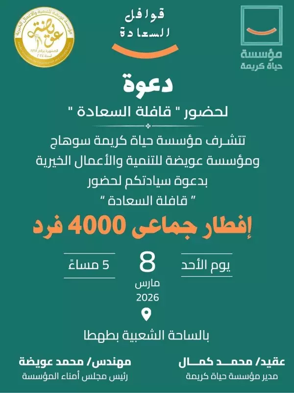 في إطار تعزيز قيم التكافل الاجتماعي ونشر أجواء المحبة خلال شهر رمضان المبارك، نظمت مؤسسة حياة كريمة بمحافظة سوهاج بالتعاون مع مؤسسة عويضة للتنمية والأعمال الخيرية، إحدى منظمات المجتمع المدني حفل إفطار جماعي ضخم ضم نحو 4000 صائم من أبناء المحافظة ، وسط حضور رسمي وشعبي واسع.