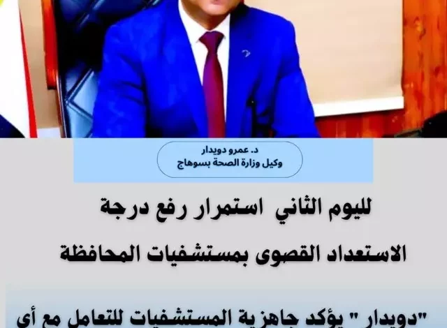 تنفيذاً لتوجيهات الأستاذ الدكتور خالد عبدالغفار وزير الصحة والسكان، ومعالي اللواء طارق راشد محافظ سوهاج، أكد السيد الدكتور عمرو دويدار وكيل وزارة الصحة بسوهاج استمرار رفع درجة الاستعداد القصوى بجميع مستشفيات المحافظة، تزامناً مع حالة عدم استقرار الطقس والتقلبات الجوية.